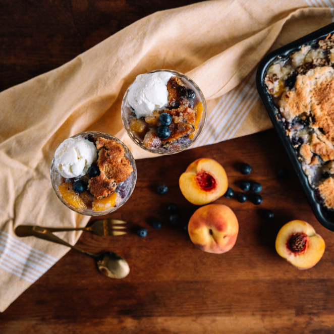 2. Sega kausis virsikud, mustikad, 30g suhkrut, sidrunimahl ja vanillisuhkur ning laota ühtlaselt küpsetusvormi.